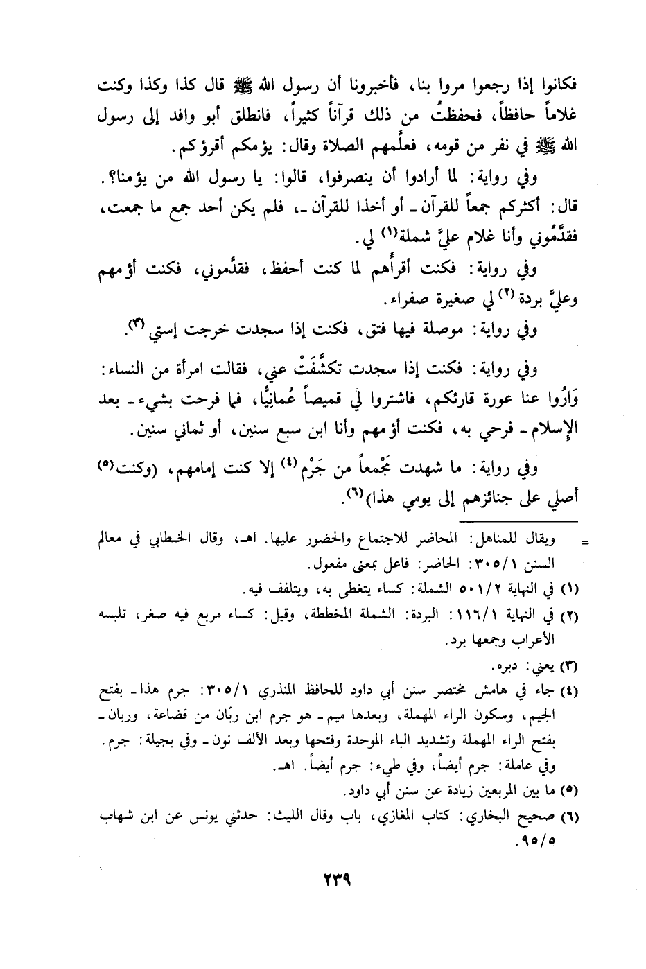 فكانوا إذا رجعوا مروا بنا، فأخبرونا أن رسول الله - صلى الله عليه وسلم - قال كذا وكذا وكنت غلاماً حافظاً، فحفظتُ من ذلك قرآناً كثيراً، فانطلق أبو وافد إلى رسول الله - صلى الله عليه وسلم - في نفر من قومه، فعلمهم الصلاة وقال: يؤمكم أقرؤكم.
