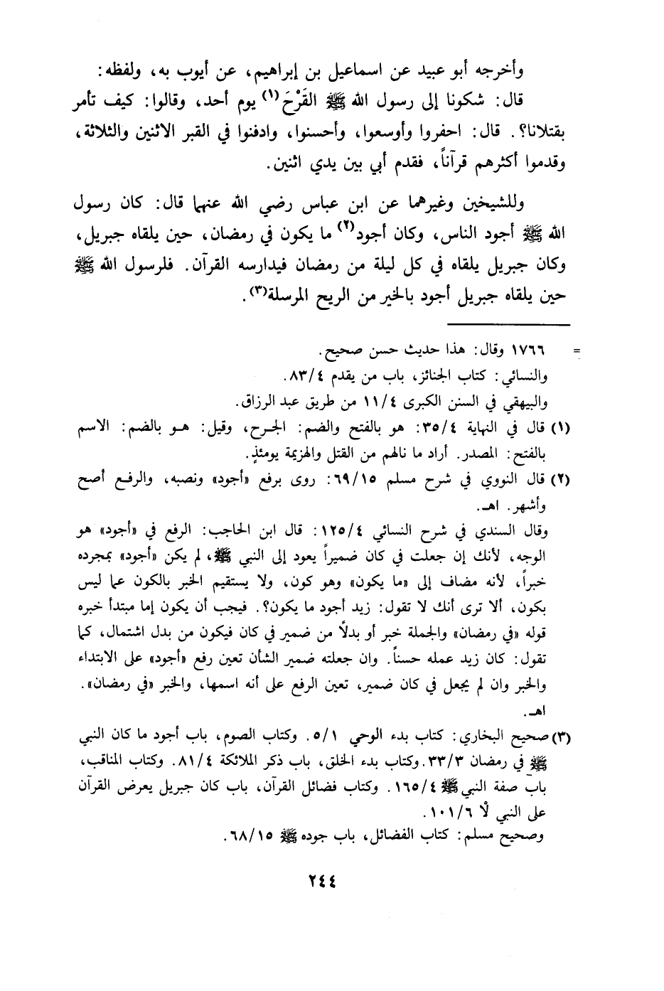 الله - صلى الله عليه وسلم - أجود الناس، وكان أجود ما يكون في رمضان، حين يلقاه جبريل، وكان جبريل يلقاه في كل ليلة من رمضان فيدارسه القرآن. فلرسول الله - صلى الله عليه وسلم - حين يلقاه جبريل أجود بالخير من الريح المرسلة.