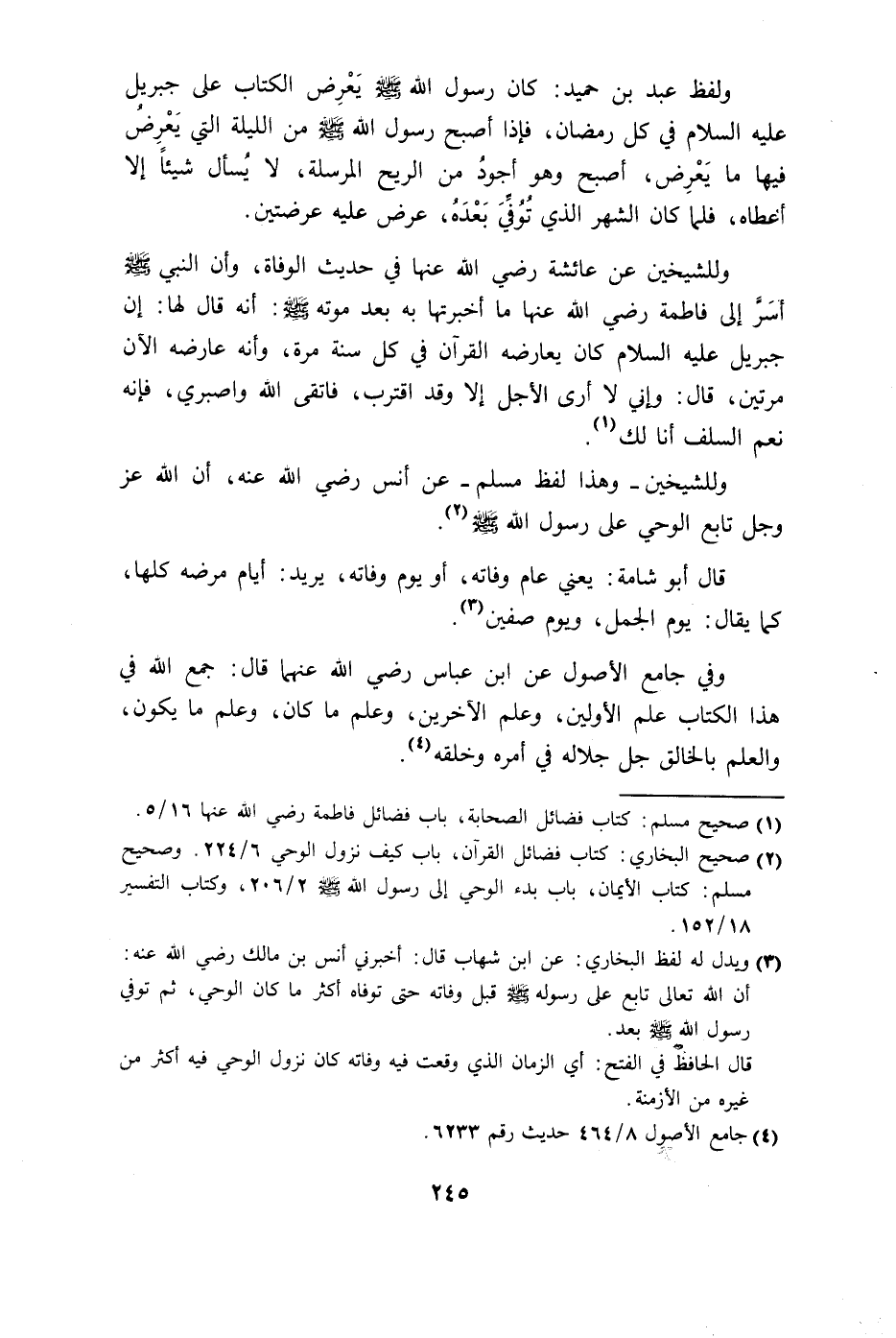 وللشيخين عن عائشة رضي الله عنها في حديث الوفاة، وأن النبي - صلى الله عليه وسلم - أْسَرَّ إلى فاطمة رضي الله عنها ما أخبرت به بعد موته - صلى الله عليه وسلم -: أنه قال لها: إن جبريل عليه السلام كان يعارضه القرآن في كل سنة مرة، وأنه عارضه الآن مرتين، قال: وإني لا أرى الأجل إلا وقد اقترب، فاتقى الله واصبري، فإنه نعم السلف أنا لك.