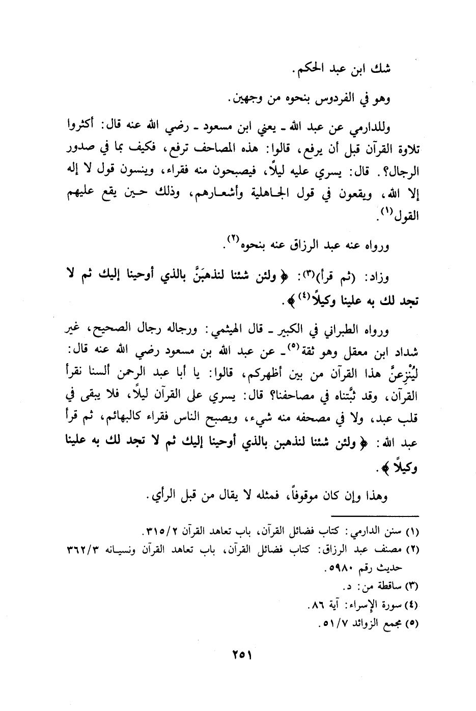 قال: يسري على القرآن ليلاً، فلا يبقى في قلب عبد، ولا في مصحفه منه شيء، ويصبح الناس فقراء كالبهائم، ثم قرأ عبد الله: (وَلَئِنْ شِئْنَا لَنَذْهَبَنَّ بِالَّذِي أَوْحَيْنَا إِلَيْكَ ثُمَّ لَا تَجِدُ لَكَ بِهِ عَلَيْنَا وَكِيلًا (86) .