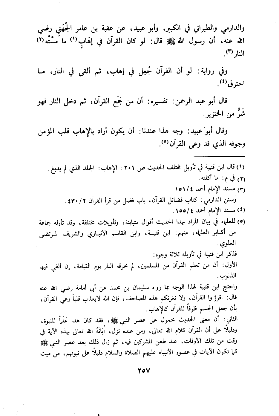 الله عنه، أن رسول الله - صلى الله عليه وسلم - قال: لو كان القرآن في إهَاب ماَ مستْه النار.