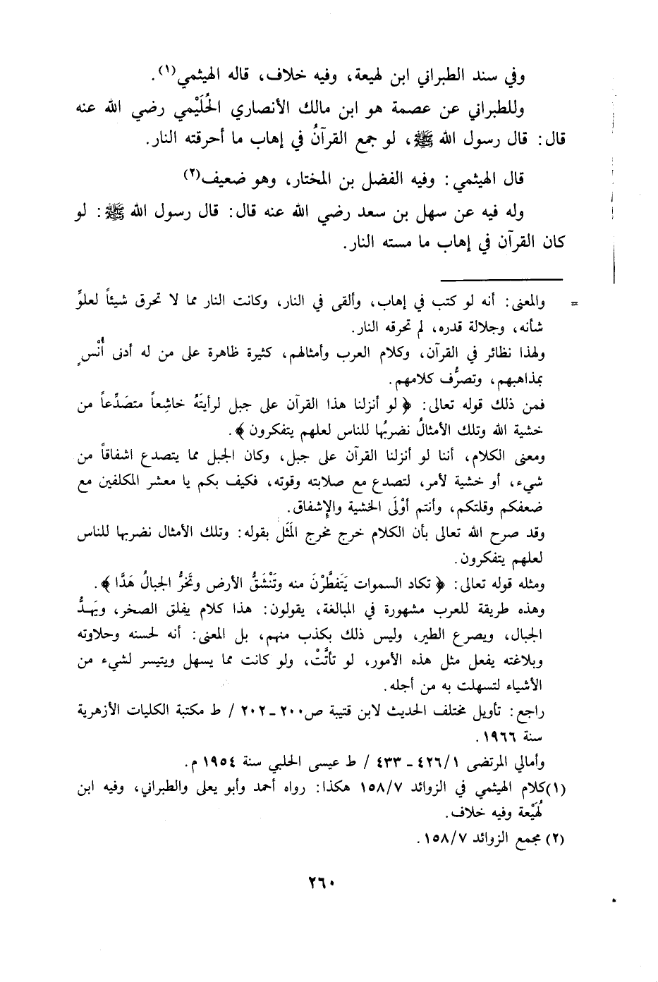 قال: قال رسول الله - صلى الله عليه وسلم -، لو جمع القرآنُ في إهاب ما أحرقته النار.