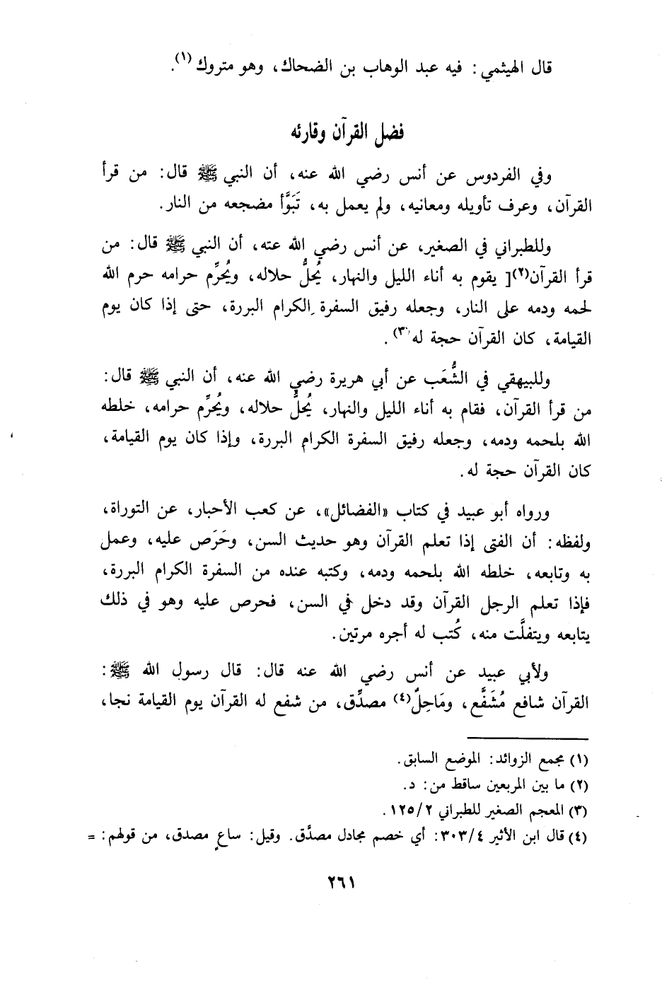 وللطبراني في الصغير، عن أنس رضي الله عنه، أن النبي - صلى الله عليه وسلم - قال: من قرأ القرآن يقوم به آناء الليل والنهار، يُحلُّ حلاله، ويُحرِّم حرامه حرم الله لحمه ودمه على النار، وجعله رفيق السفرةِ الكرام البررة، حتى إذا كان يوم القيامة، كان القرآن حجة له".