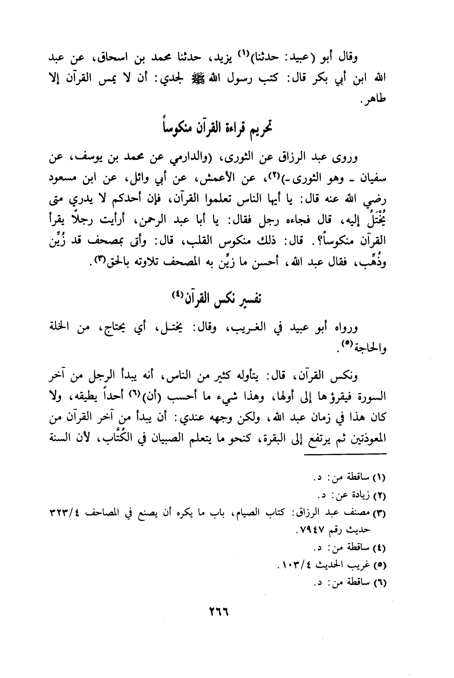القرآن منكوساً؟. قال: ذلك منكوس القلب، قال: وأتى بمصحف قد زُيِّن وذُهِّب، فقال عبد الله، أحسن ما زُيِّن به المصحف تلاوته بالحق.