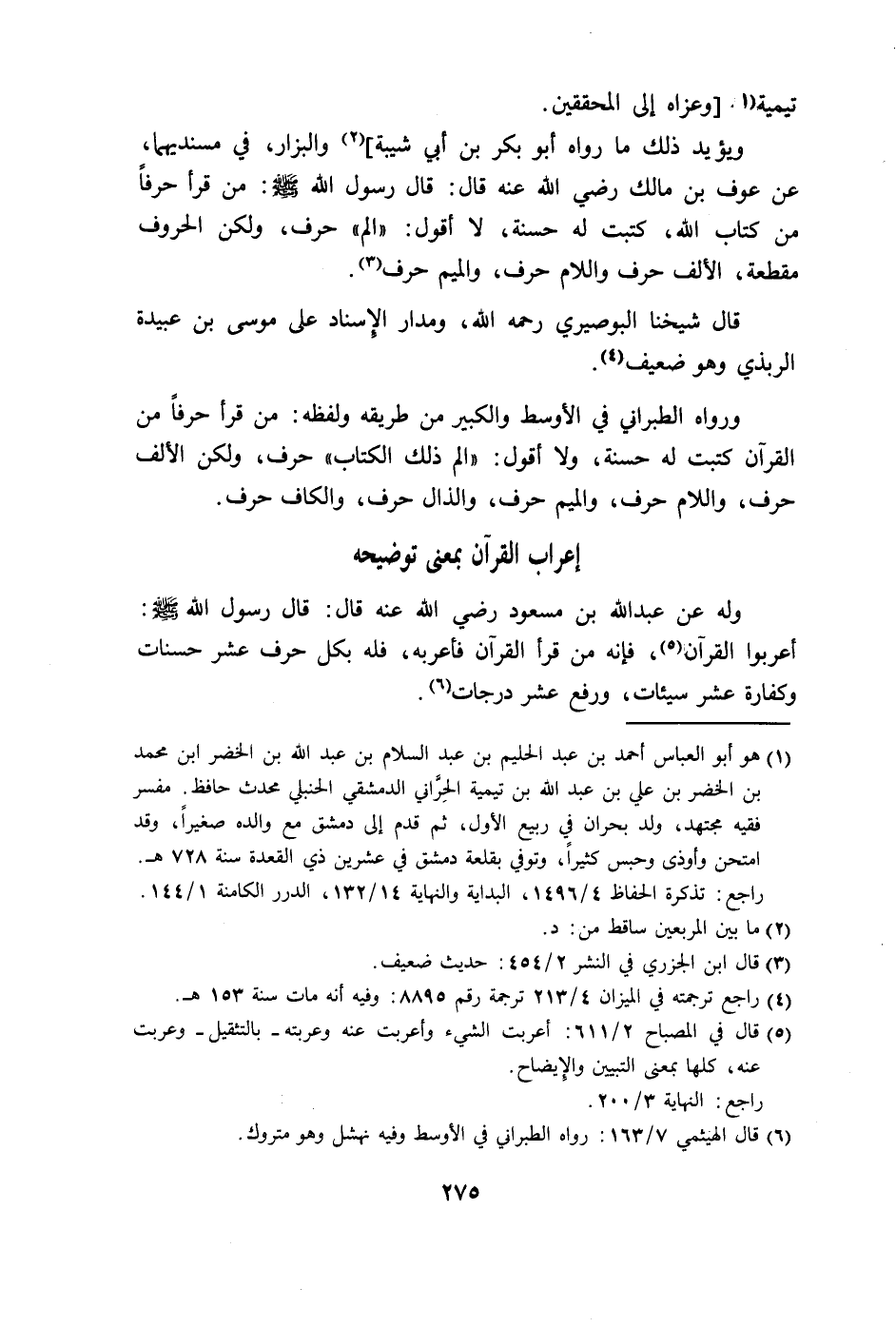 وله عن عبد الله بن مسعود رضي الله عنه قال: قال رسول الله - صلى الله عليه وسلم -: أعربوا القرآن، فإنه من قرأ القرآن فأعربه، فله بكل حرف عشر حسنات وكفارة عشر سيئات، ورفع عشر درجات.