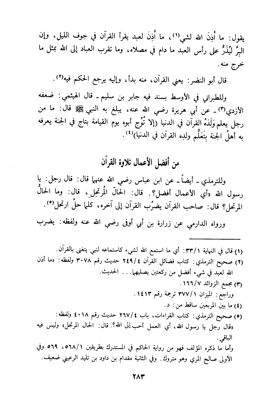 الأزدي - عن أبي هريرة رضي الله عنه، يبلغ به النبي - صلى الله عليه وسلم - قال: ما من رجل يعلم وَلَدَهُ القرآن في الدنيا إلا تُوِّج أبوه يوم القيامة بتاج في الجنة يعرفه به أهلُ الجنة بِتَعَلُّم ولدِه القرآن في الدنيا.