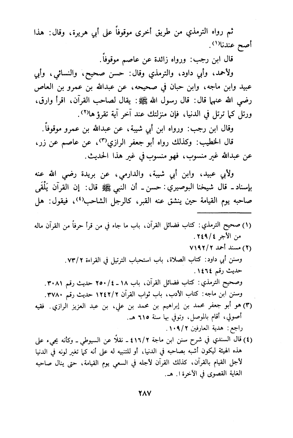 رضي الله عنهما قال: قال رسول الله - صلى الله عليه وسلم -: يقال لصاحب القرآن، اقرأ وارق، ورتل كما ترتل في الدنيا، فإن منزلتك عند آخر آية تقرؤها.