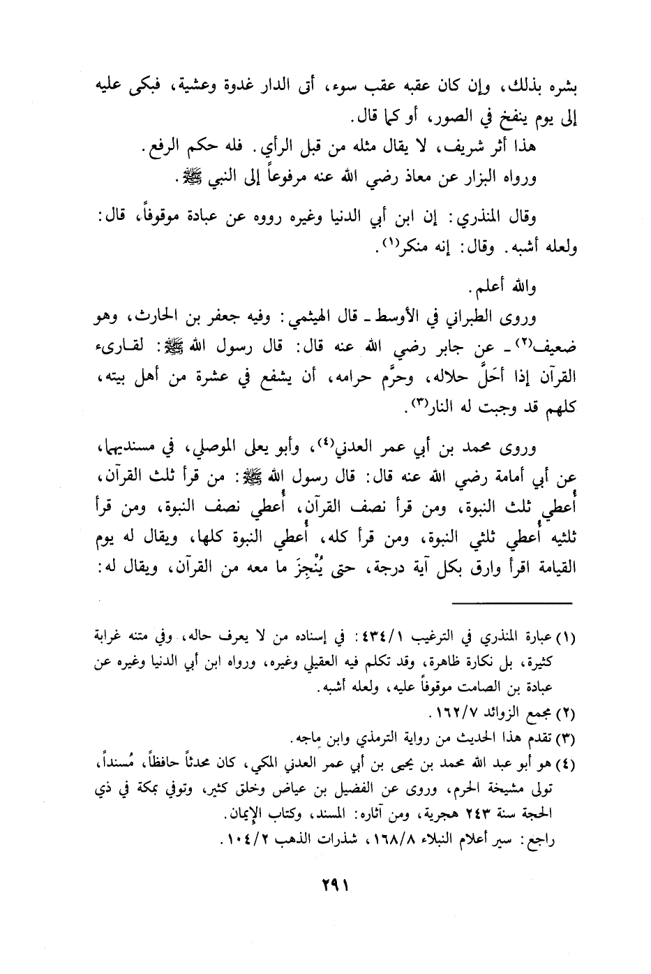 عن أبي أمامة رضي الله عنه قال: قال رسول الله - صلى الله عليه وسلم -: من قرأ ثلث القرآن، أعطي ثلث النبوة، ومن قرأ نصف القرآن، أعطي نصف النبوة، ومن قرأ ثلثيه أعطي ثلثي النبوة، ومن قرأ كله، أعطي النبوة كلها، ويقال له يوم القيامة اقرأ وارق بكل آية درجة، حتى يُنْجِزَ ما معه من القرآن، ويقال له: