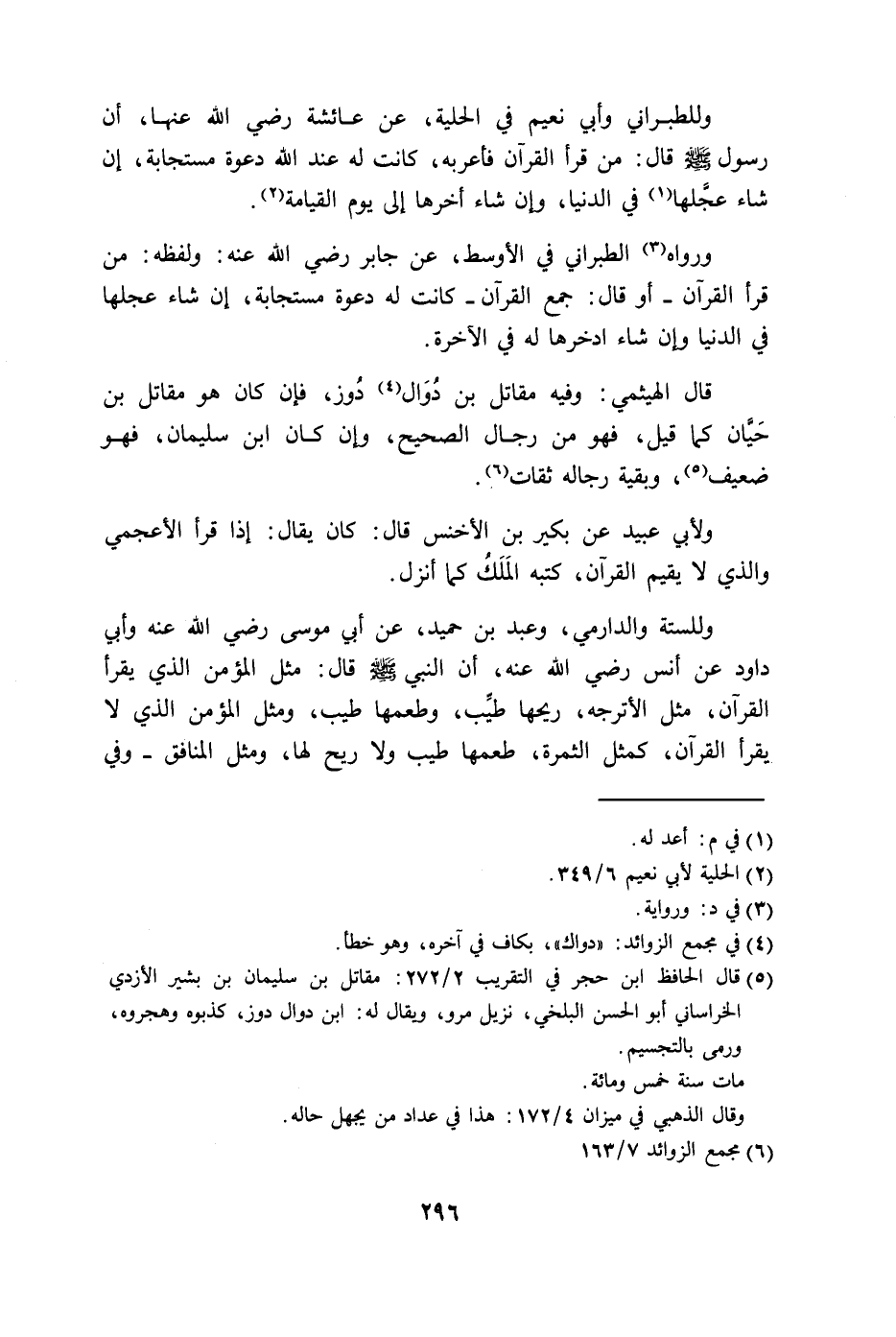 داود عن أنس رضي الله عنه، أن النبي - صلى الله عليه وسلم - قال: مثل المؤمن الذي يقرأ القرآن، مثل الأترجه، ريحها طيِّب، وطعمها طيب، ومثل المؤمن الذي لا يقرأ القرآن، كمثل الثمرة، طعمها طيب ولا ريح لها، ومثل المنافق - وفي
