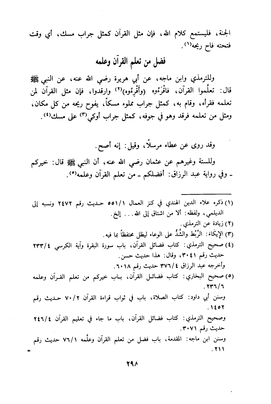 وللستة وغيرهم عن عثمان رضي الله عنه، أن النبي - صلى الله عليه وسلم - قال: خيركم - وفي رواية عبد الرزاق: أفضلكم - من تعلم القرآن وعلمه.