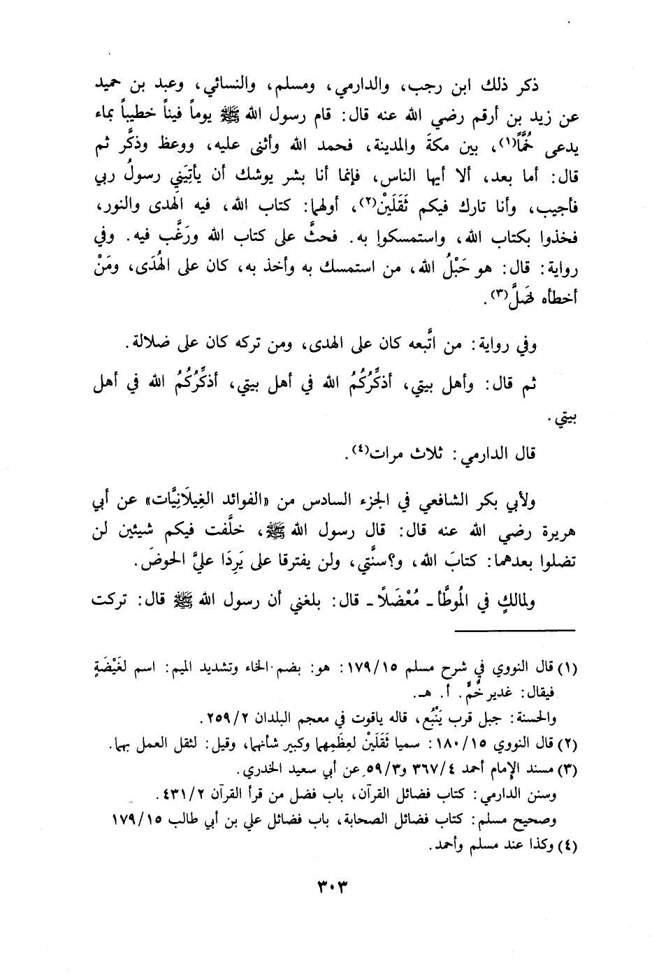 عن زيد بن أرقم رضي الله عنه قال: قام رسول الله - صلى الله عليه وسلم - يوما فيناً خطيبا بماء يدعى خُمَّاً، بين مكةَ والمدينة، فحمد الله وأثنى عليه، ووعظ وذكَّر ثم قال: أما بعد، ألا أيها الناس، فإنما أنا بشر يوشك أن يأتِيَني رسولُ ربي فأجيب، وأنا تارك فيكم ثَقَلَيْن، أولهما: كتاب الله، فيه الَهدى والنور، فخذوا بكتاب الله، واستمسكوا به. فحثَّ على كتاب الله ورَغب فيه.