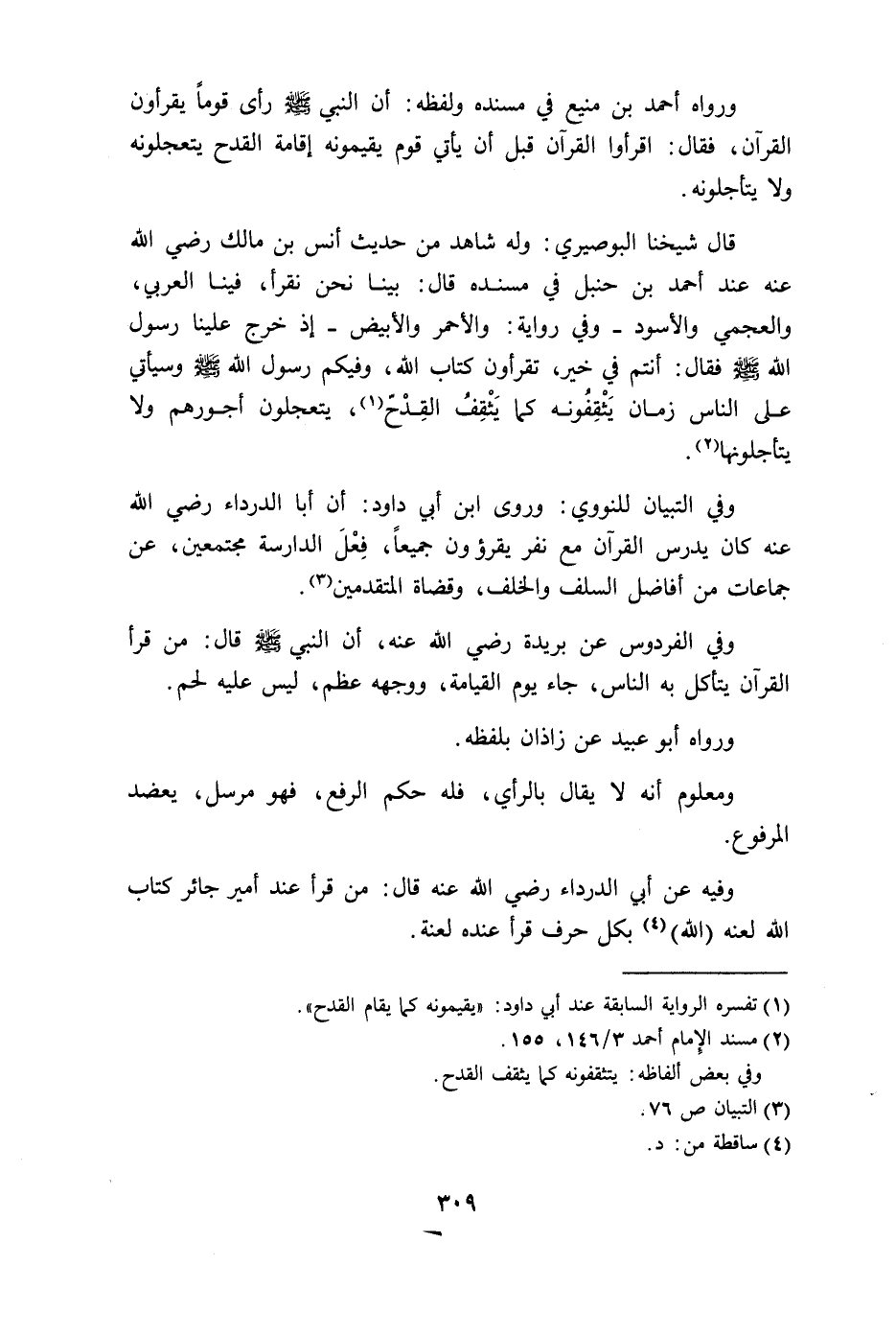 ورواه أحمد بن منيع في مسنده ولفظه: أن النبي - صلى الله عليه وسلم - رأى قوما يقرأون القرآن، فقال: اقرأوا القرآن قبل أن يأتي قوم يقيمونه إقامة القدح يتعجلونه ولا يتأجلونه.