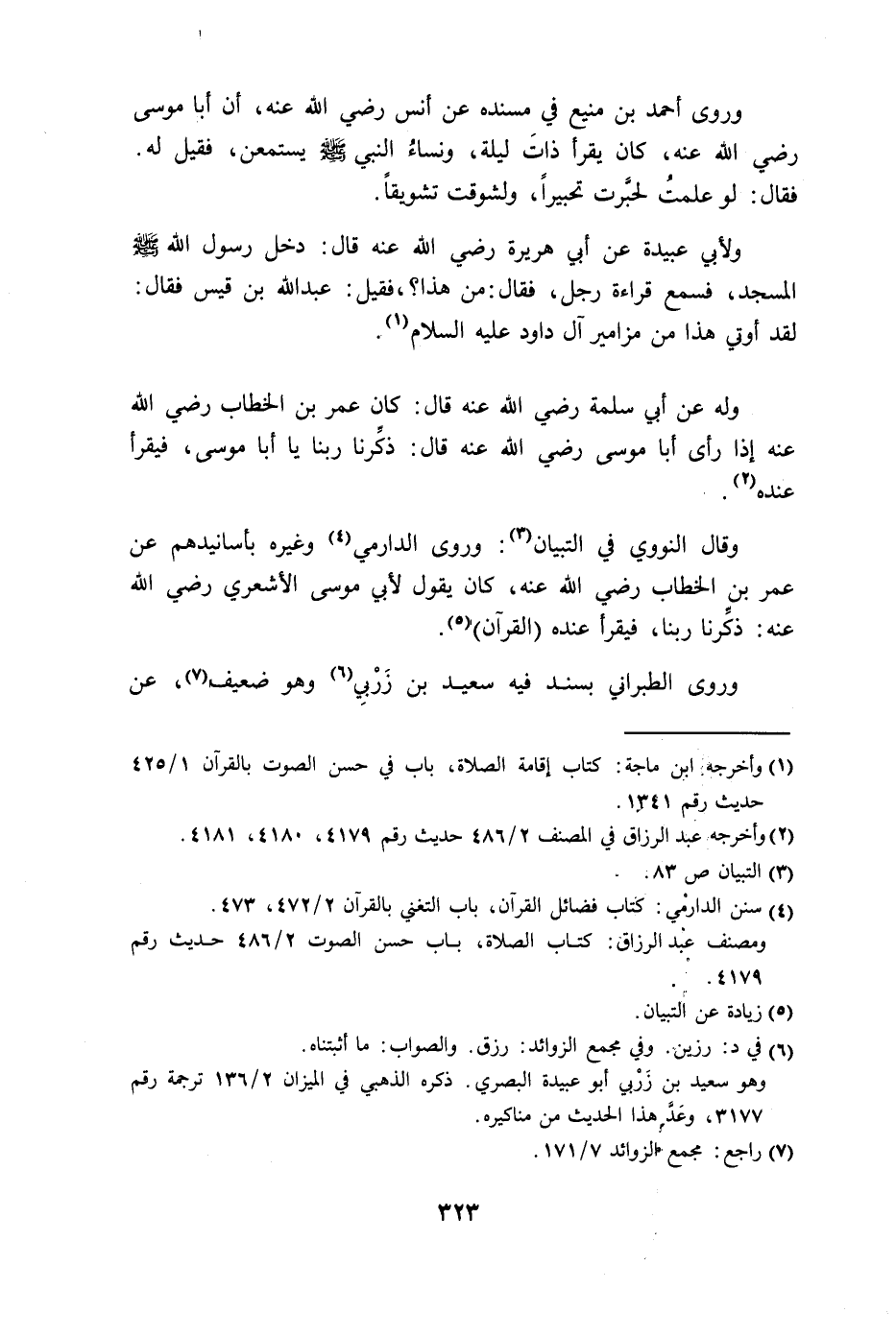 ولأبي عبيدة عن أبي هريرة رضي الله عنه قال: دخل رسول الله - صلى الله عليه وسلم - المسجد، فسمع قراءة رجل، فقال: من هذا؟ ، فقيل: عبد الله بن قيس فقال: لقد أوتي هذا من مزامير آل داود عليه السلام.