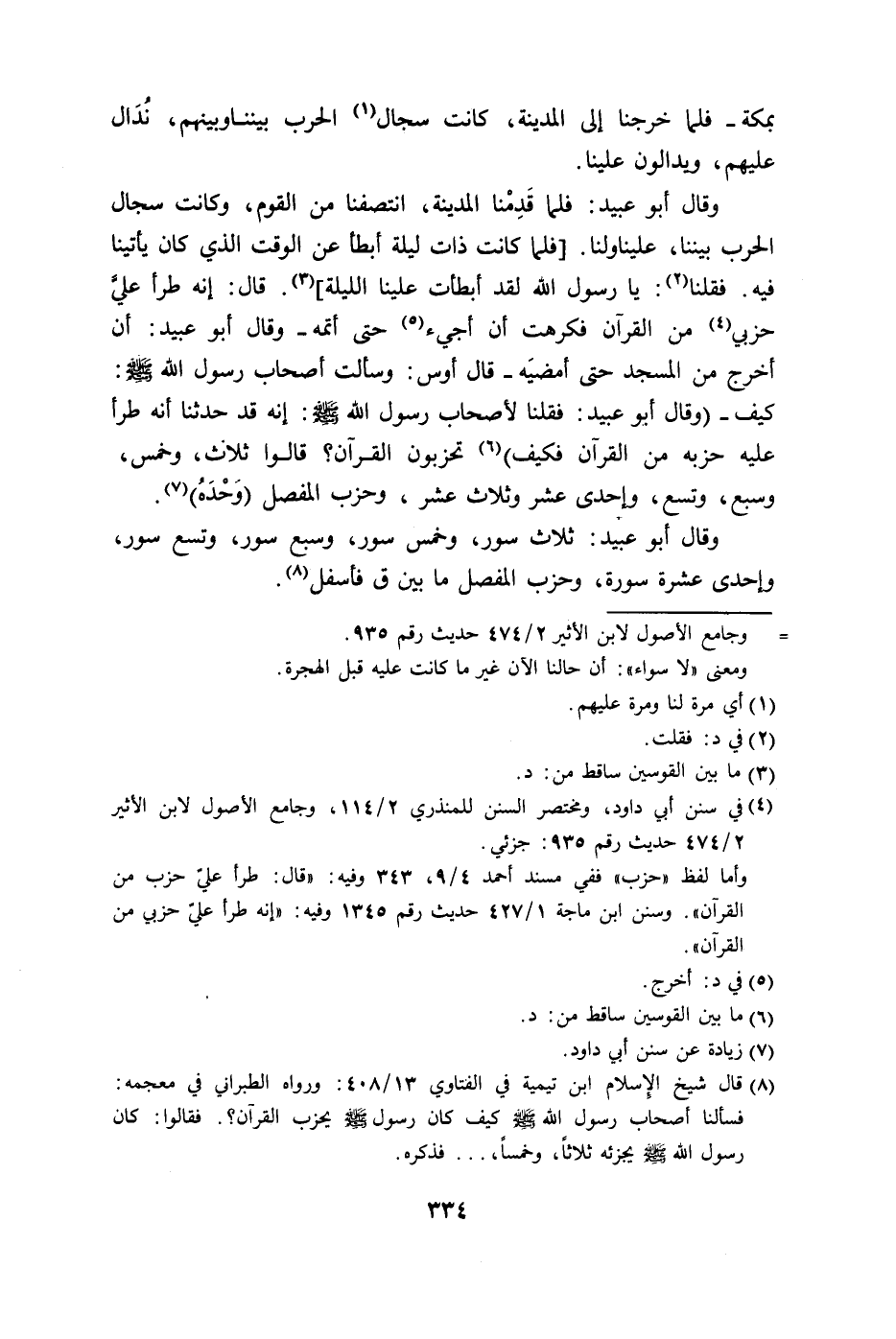 وقال أبو عبيد: أن أخرج من المسجد حتى أمضيَه - قال أوس: وسألت أصحاب رسول الله - صلى الله عليه وسلم -: كيف - (وقال أيو عبيد: فقلنا لأصحاب رسول الله - صلى الله عليه وسلم -: إنه قد حدثنا أنه طرأ