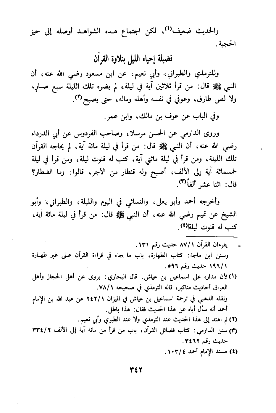 رضي الله عنه، أن النبي - صلى الله عليه وسلم - قال: من قرأ في ليلة مائة آية، لم يحاجه القرآن تلك الليلة، ومن قرأ في ليلة مائتي آية، كتب له قنوت ليلة، ومن قرأ في ليلة خمسمائة آية إلى الألف، أصبح وله قنطار من الأجر، قالوا: وما القنطار؟