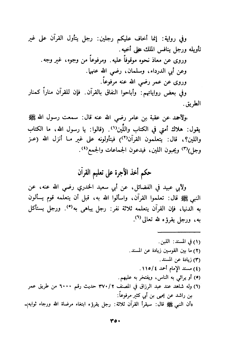 النبي - صلى الله عليه وسلم - قال: تعلموا القرآن، واسألوا الله به، قبل أن يتعلمه قوم يسألون به الدنيا، فإن القرآن يتعلمه ثلاثة نفر: رجل يباهى به. ورجل يستأكل به، ورجل يقرؤه لله تعالى.