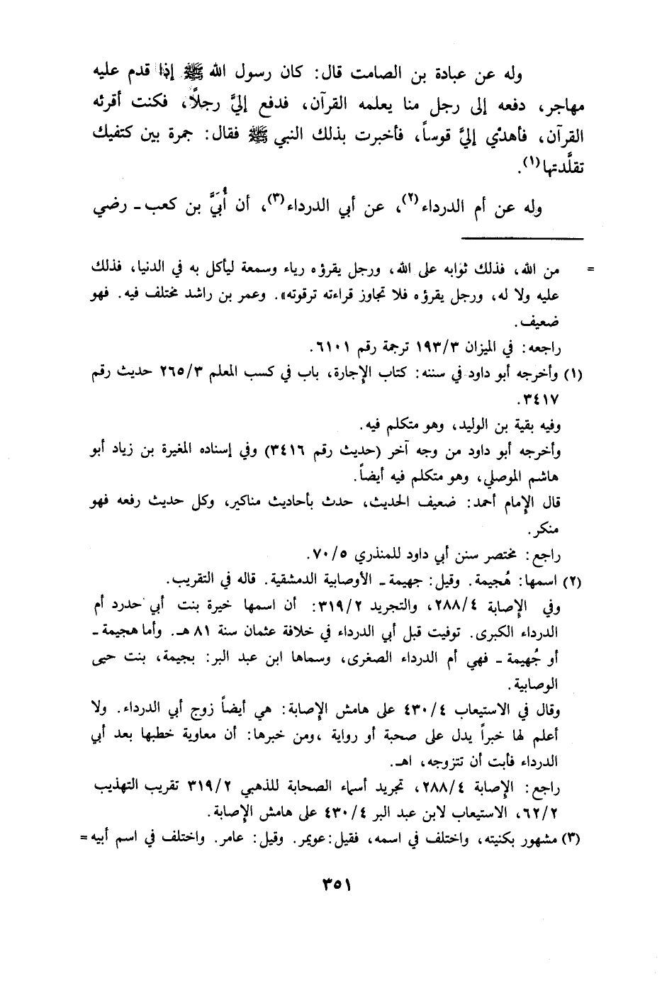 وله عن أم الدرداء، عن أبي الدرداء، أن ابَي بن كعب - رضي الله عنه -