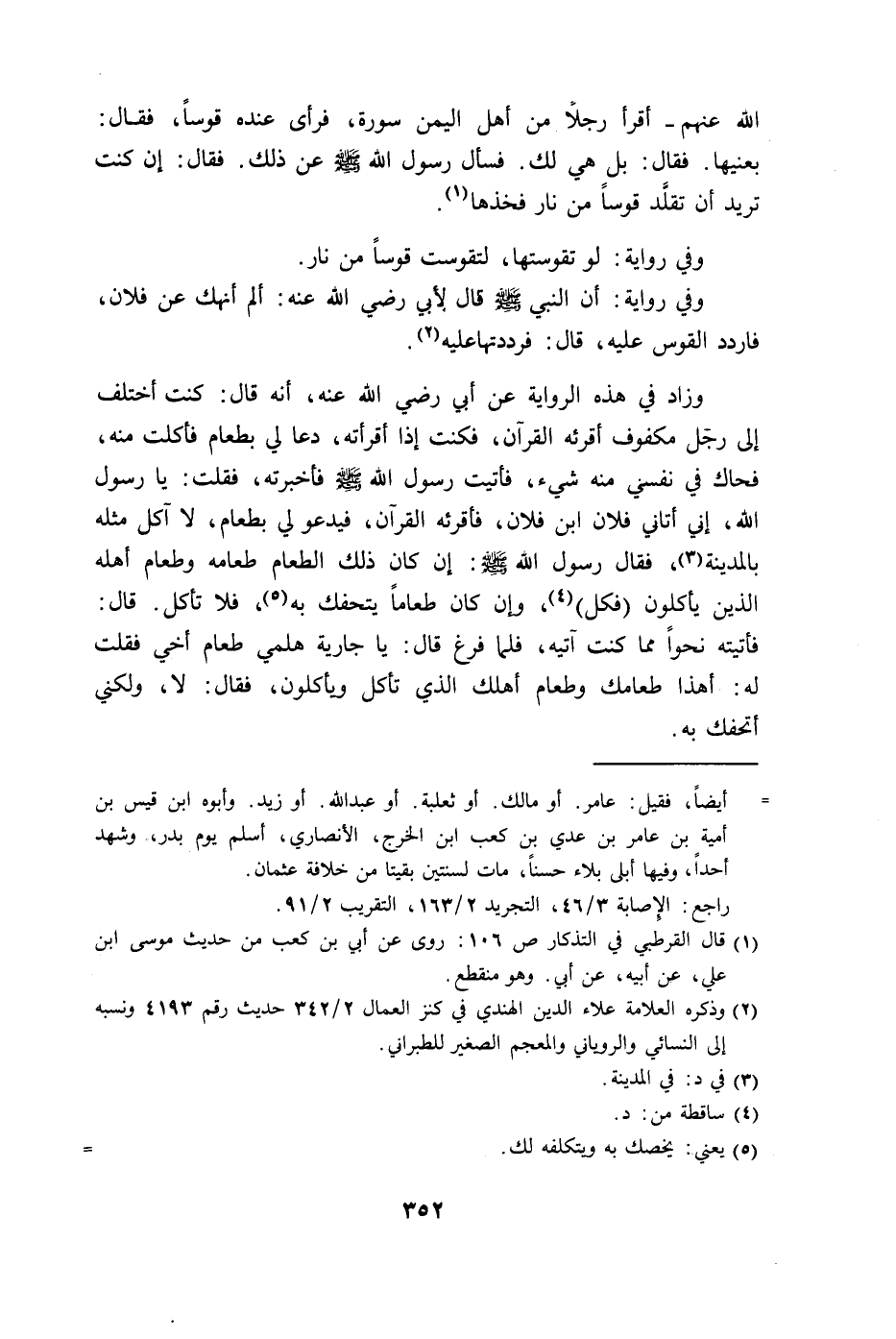 وفي رواية: أن النبي - صلى الله عليه وسلم - قال لأبي رضي الله عنه: ألم أنهك عن فلان، فاردد القوس عليه، قال: فرددتها عليه.