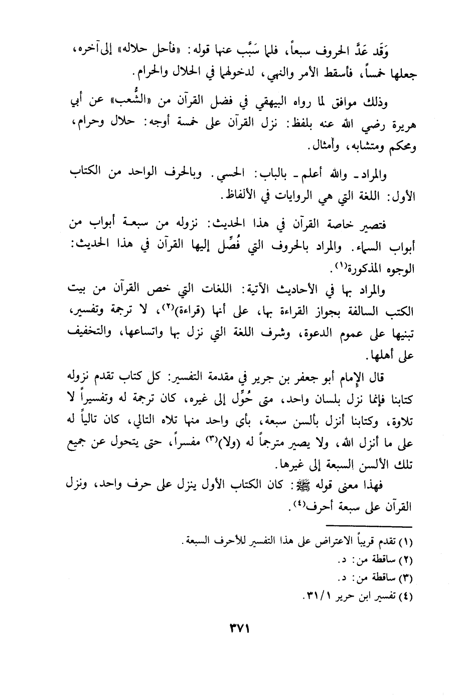 فهذا معنى قوله - صلى الله عليه وسلم -: كان الكتاب الأول ينزل على حرف واحد، ونزل القرآن على سبعة أحرف.