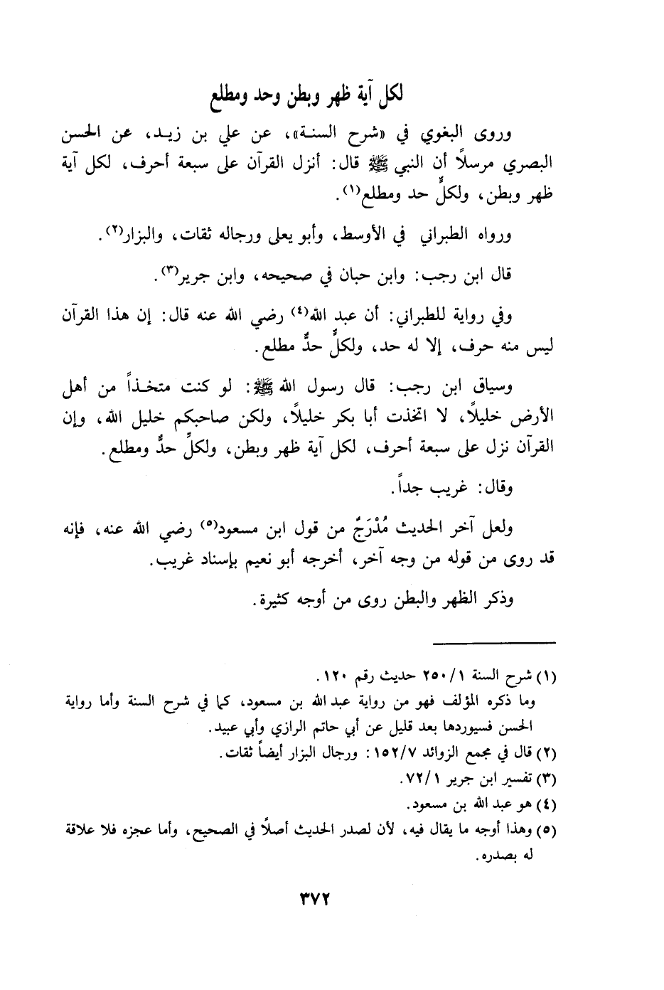 وسياق ابن رجب: قال رسول الله - صلى الله عليه وسلم -: لو كنت متخذاً من أهل الأرض خليلاً، لاتخذت أبا بكر خليلاً، ولكن صاحبكم خليل الله، وإن القرآن نزل على سبعة أحرف، لكل آية ظهر وبطن، ولكلِّ حدّ ومطلع.