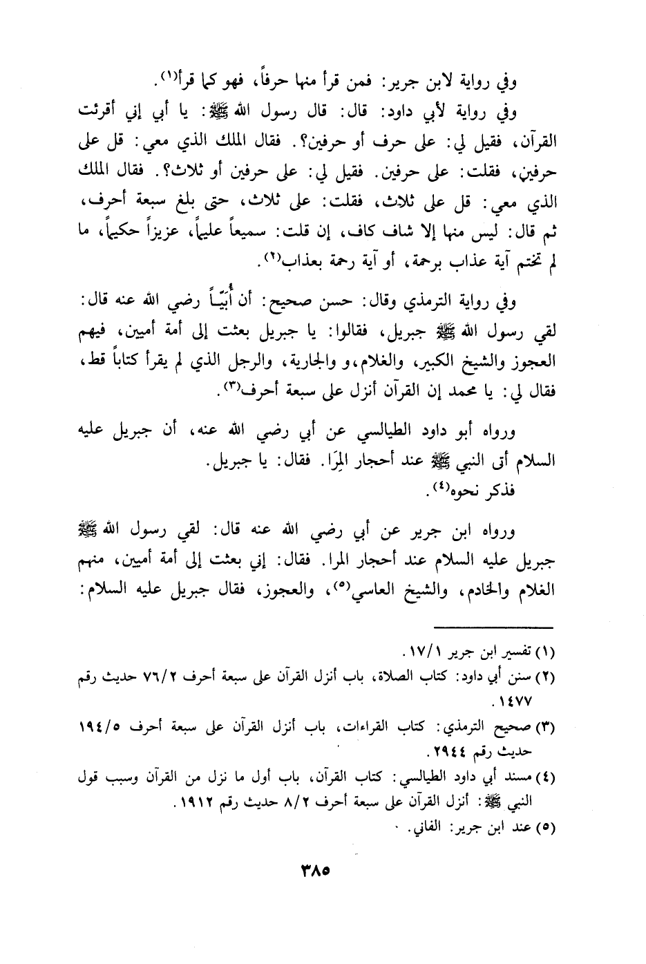لقي رسول الله - صلى الله عليه وسلم - جبريل، فقالوا: يا جبريل بعثت إلى أمة أميين، فيهم العجوز والشيخ الكبير، والغلام، والجارية، والرجل الذي لم يقرأ كتاباً قط، فقال لي: يا محمد إن القرآن أنزل على سبعة أحرف.