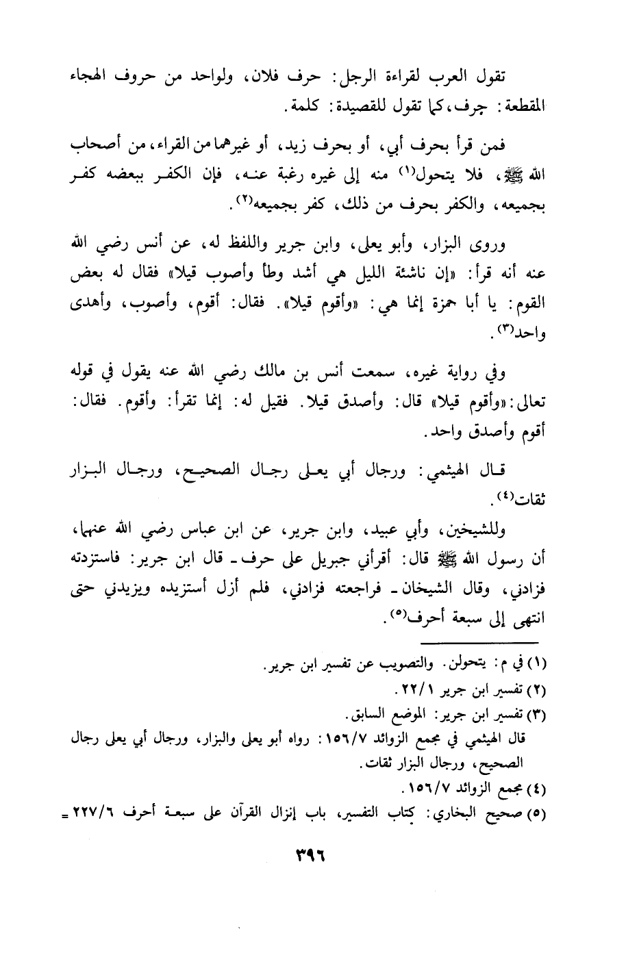 فمن قرأ بحرف أبي، أو بحرف زيد، أو غيرهما من القراء، من أصحاب رسول الله - صلى الله عليه وسلم -، فلا يتحول منه إلى غيره رغبة عنه، فإن الكفر ببعضه كفر بجميعه، والكفر بحرف من ذلك، كفر بجميعه.