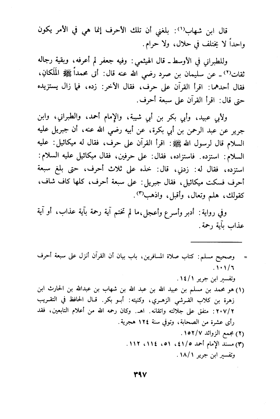 السلام قال لرسول الله - صلى الله عليه وسلم -: اقرأ القرآن على حرف، فقال له ميكائيل: عليه السلام: استزده. فاستزاده، فقال: على حرفين، فقال ميكائيل عليه السلام: استزده، فقال له: زدني، قال: خذه على ثلاث أحرف، حتى بلغ سبعة أحرف فسكت ميكائيل، فقال جبريل: على سبعة أحرف، كلها كاف شاف.