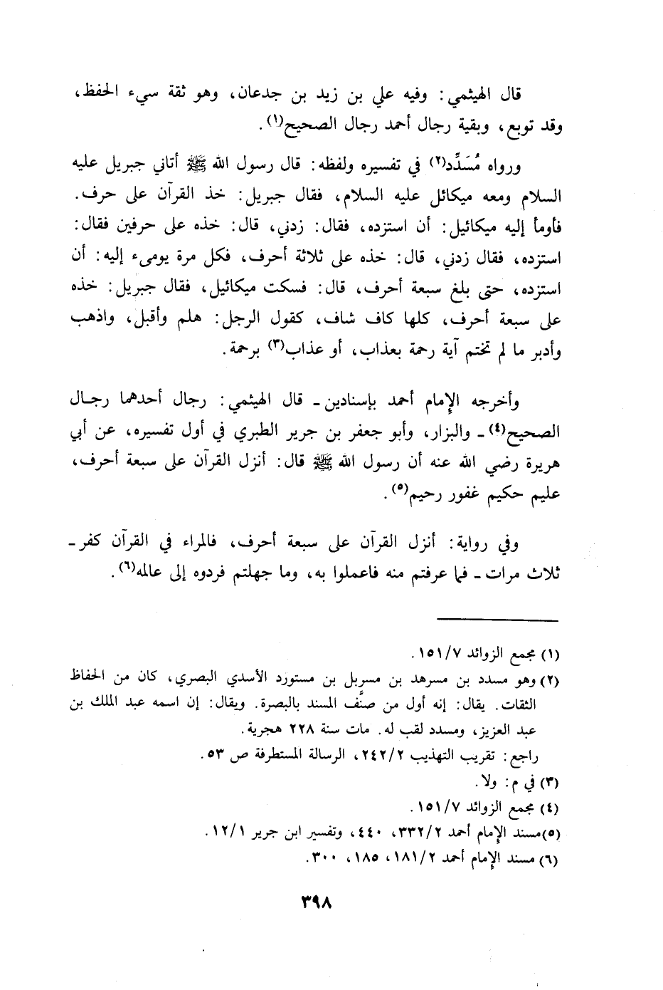 ورواه مُسَدد في تفسيره ولفظه: قال رسول الله - صلى الله عليه وسلم - أتاني جبريل عليه السلام ومعه ميكائل عليه السلام، فقال جبريل: خذ القرآن على حرف.