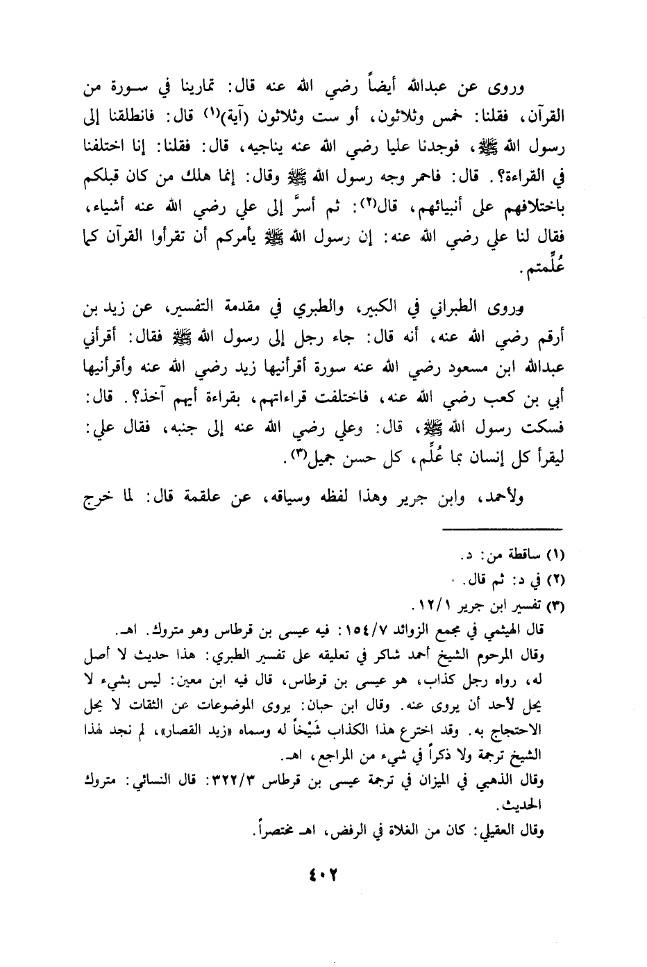 أرقم رضي الله عنه، أنه قال: جاء رجل إلى رسول الله - صلى الله عليه وسلم - فقال: أقرأني عبد الله ابن مسعود رضى الله عنه سورة أقرأنيها زيد رضى الله عنه وأقرأنيها أبي بن كعب رضي الله عنه، فاختلفت قراءاتهم، بقراءة أيهم آخذ؟.