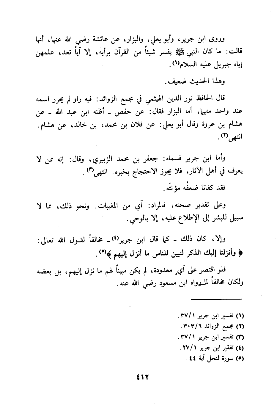 قالت: ما كان النبي - صلى الله عليه وسلم - يفسر شيئاً من القرآن برأيه، إلا آياً تعد، علمهن إياه جبريل عليه السلام.