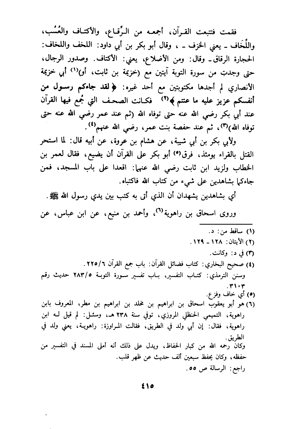 واللَخَاف - يعني الخزف -، وقال أبو بكر بن أبي داود: اللخف واللخاف: الحجارة الرقاق - وقال: ومن الأضلاع، يعني: الأكتاف. وصدور الرجال، حتى وجدتِ من سورة التوبة آيتين مع خزيمة بن ثابت، أو أبي خزيمة الأنصاري لم أجدها مكتوبتين مع أحد غيره: (لَقَدْ جَاءَكُمْ رَسُولٌ مِنْ أَنْفُسِكُمْ عَزِيزٌ عَلَيْهِ مَا عَنِتُّمْ حَرِيصٌ عَلَيْكُمْ بِالْمُؤْمِنِينَ رَءُوفٌ رَحِيمٌ (128) فَإِنْ تَوَلَّوْا فَقُلْ حَسْبِيَ اللَّهُ لَا إِلَهَ إِلَّا هُوَ عَلَيْهِ تَوَكَّلْتُ وَهُوَ رَبُّ الْعَرْشِ الْعَظِيمِ (129)