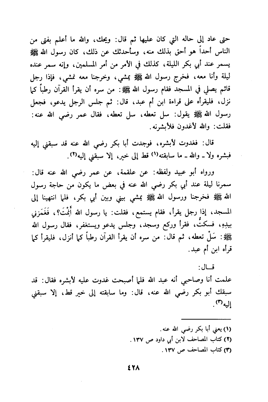 الله عنه فخرجنا ورسول الله - صلى الله عليه وسلم - يمشي بيني وبين أبي بكر، فلما انتهينا الى المسجد، إذا رجل يقرأ، فقام يستمع، فقلت: يا رسول الله أنِمْتَ؟ ، فَغَمَزني بيدِهِ، فسكتُ، فقرأ وركع وسجد، وجلس يدعو ويستغفر، فقال رسول الله - صلى الله عليه وسلم -: سَلْ تعطه، ثم قال: من سره أن يقرأ القرآن رطباً كما أنزل، فليقرأ كما قرأه ابن أم عبد.