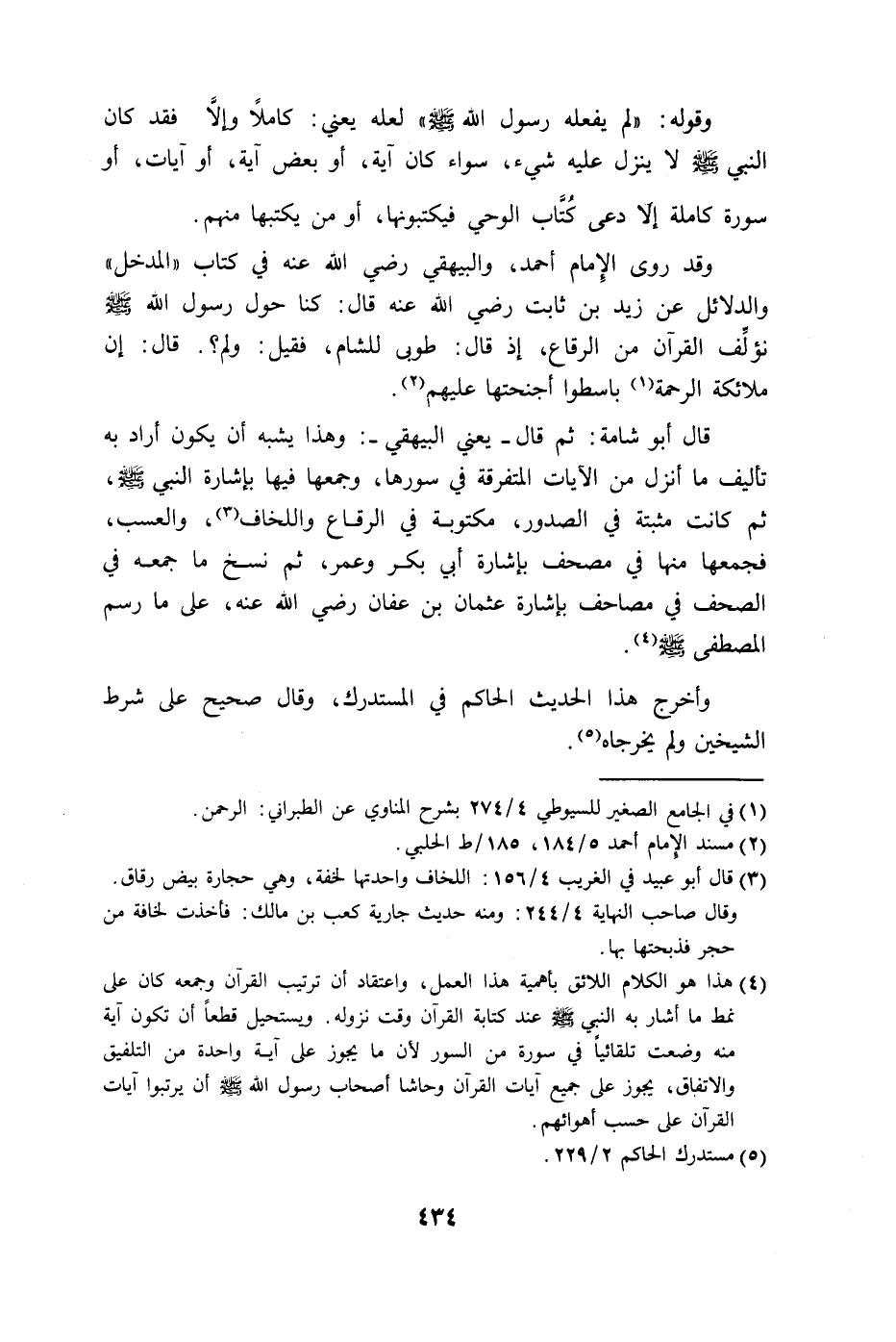 وقوله: "لم يفعله رسول الله - صلى الله عليه وسلم - لعله يعني: كاملًا وإلا فقد كان النبي - صلى الله عليه وسلم - لا ينزل عليه شيء، سواء كان آية، أو بعض آية، أو آيات، أو سورة كاملة إلا دعى كُتَّاب الوحي فيكتبونها، أو من يكتبها منهم.