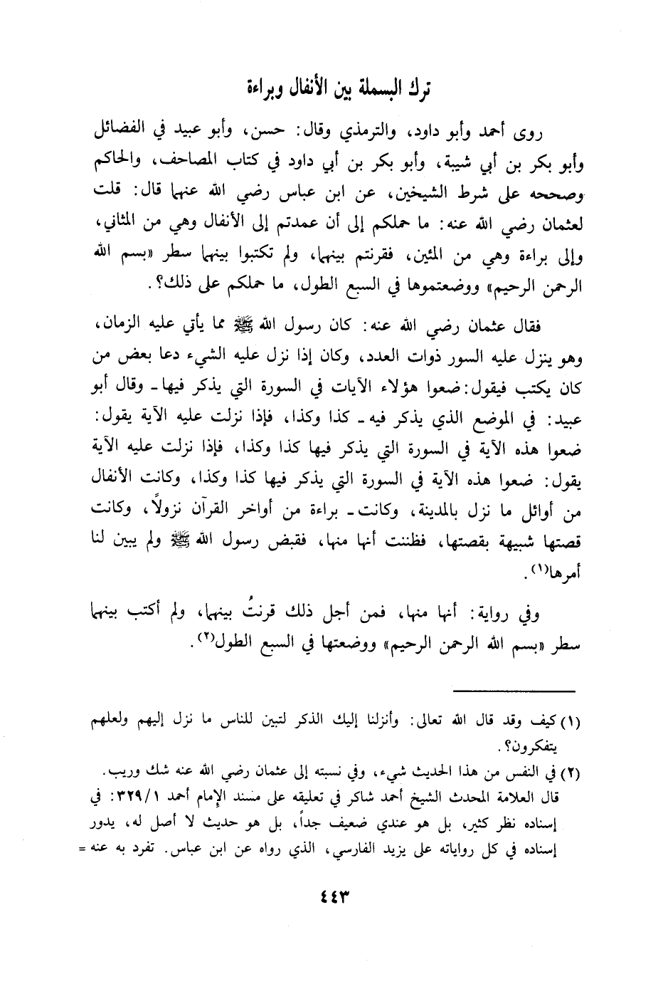 وإلى براءة وهي من المئين، فقرنتم بينهما، ولم تكتبوا بينهما سطر "بِسْمِ اللَّهِ الرَّحْمَنِ الرَّحِيمِ" ووضعتموها في السبع الطول، ما حملكم على ذلك؟.