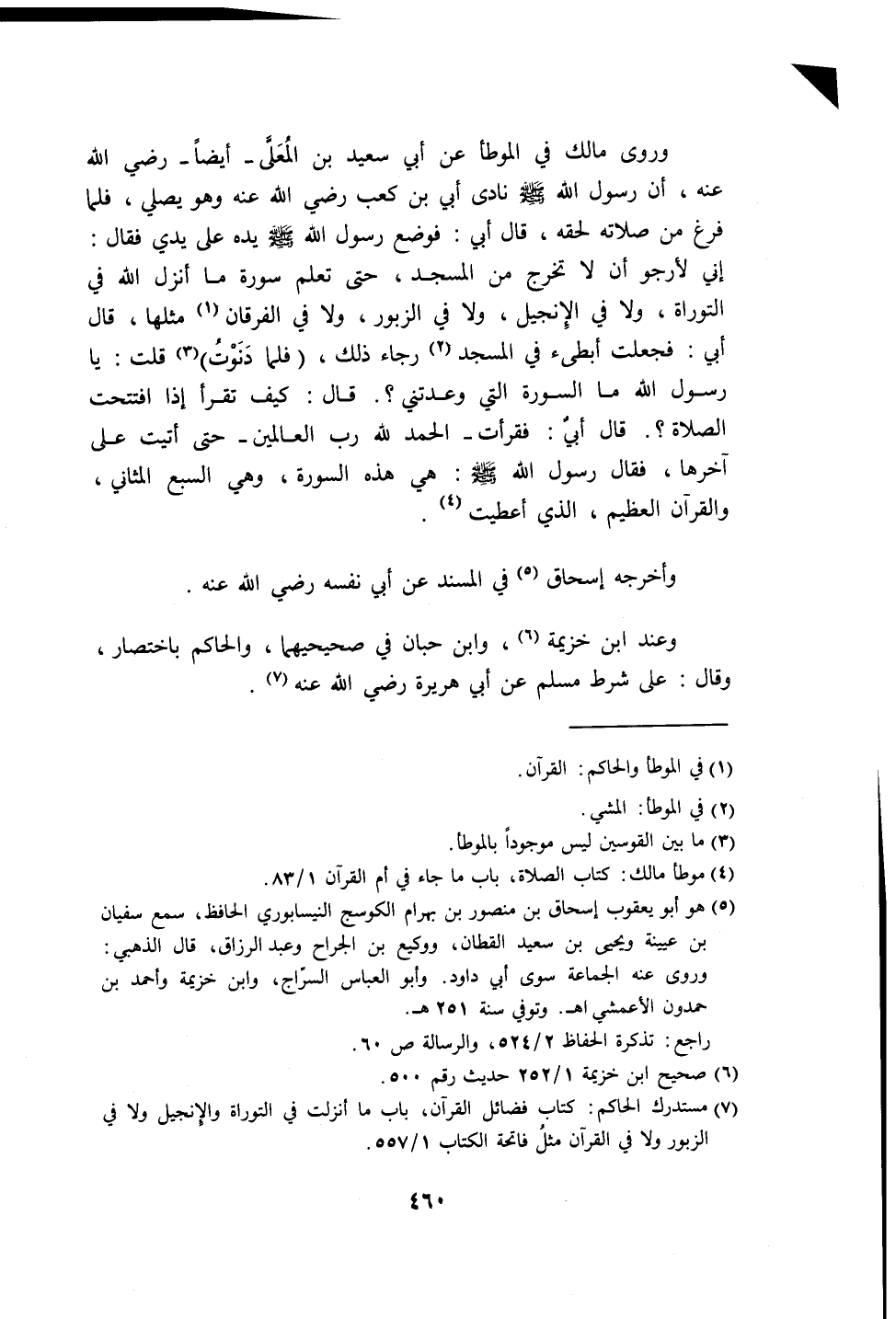 عنه، أن رسول الله - صلى الله عليه وسلم - نادى أبي بن كعب رضي الله عنه وهو يصلي، فلما فرغ من صلاته لحقه، قال أبي: فوضع رسول الله - صلى الله عليه وسلم - يده على يدي فقال: إني لأرجو أن لا تخرج من المسجد، حتى تعلم سورة ما أنزل الله في التوراة، ولا في الِإنجيل، ولا في الزبور، ولا في الفرقان مثلها، قال أبي: فجعلت أبطىء في المسجد رجاء ذلك، فلما دَنَوْتُ قلت: يا رسول الله ما السورة التي وعدتني؟.