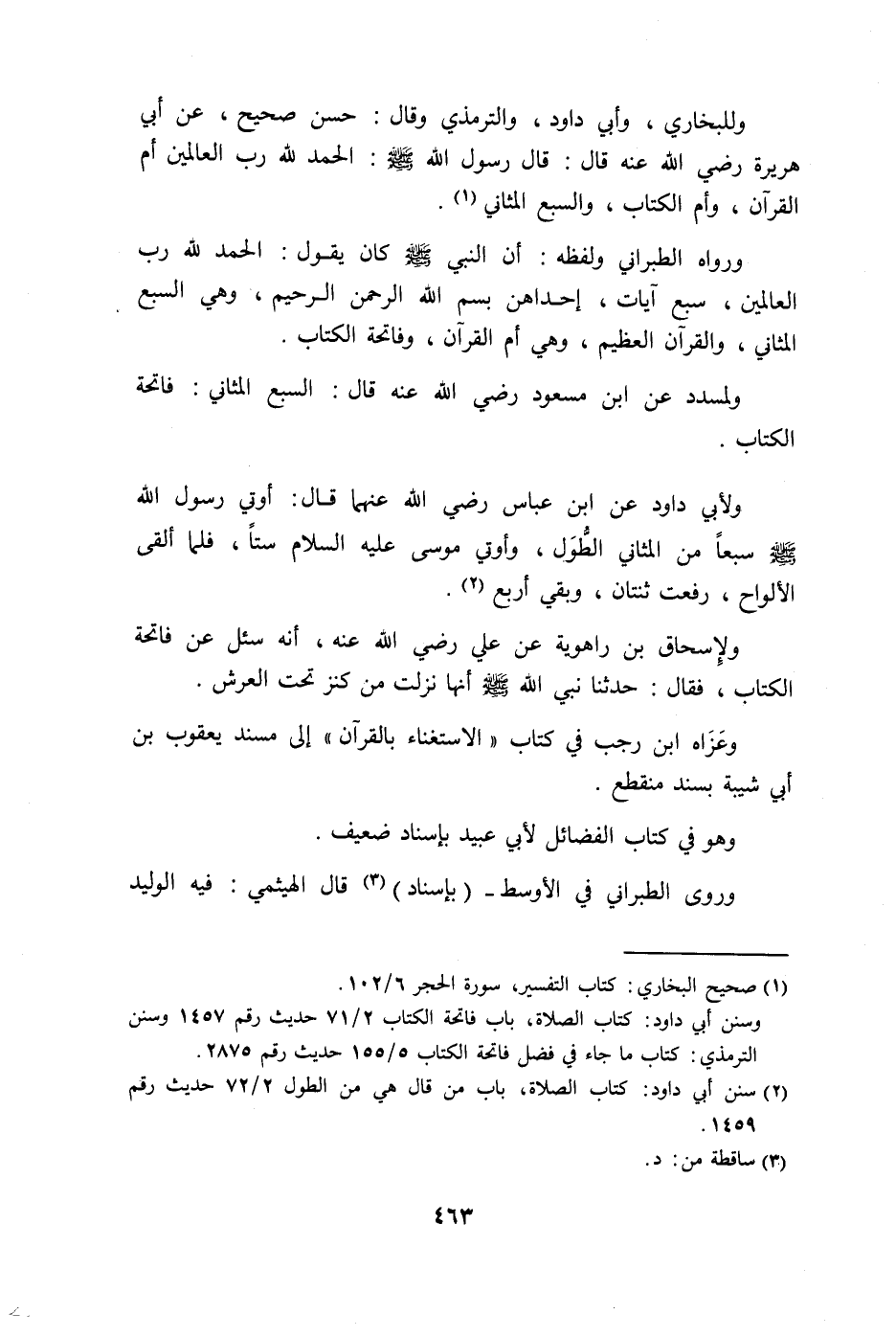 هريرة رضي الله عنه قال: قال رسول الله - صلى الله عليه وسلم -: (الحمد لله رب العالمين) أم القرآن، وأم الكتاب، والسبع المثاني.