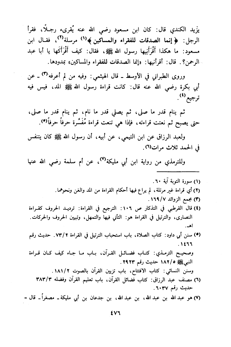 مسعود: ما هكذا أَقْرَأَنِيها رسول الله - صلى الله عليه وسلم -، فقال: كيف أَقْرَأَكَها يا أبا عبد الرحمن؟. قال: أقرأنيها: "إِنَّمَا الصَّدَقَاتُ لِلْفُقَرَاءِ وَالْمَسَاكِينِ" بمدودها.