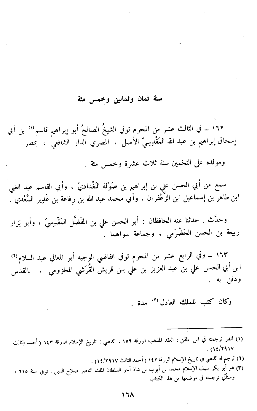 163 - وفي الرابع عشر من المحرم توفي القاضي الوجيه أبو المعالي عبد السلام بن أبي الحسن علي بن عبد العزيز بن علي بن قريش القرشي المخزومي، بالقدس ودفن به.