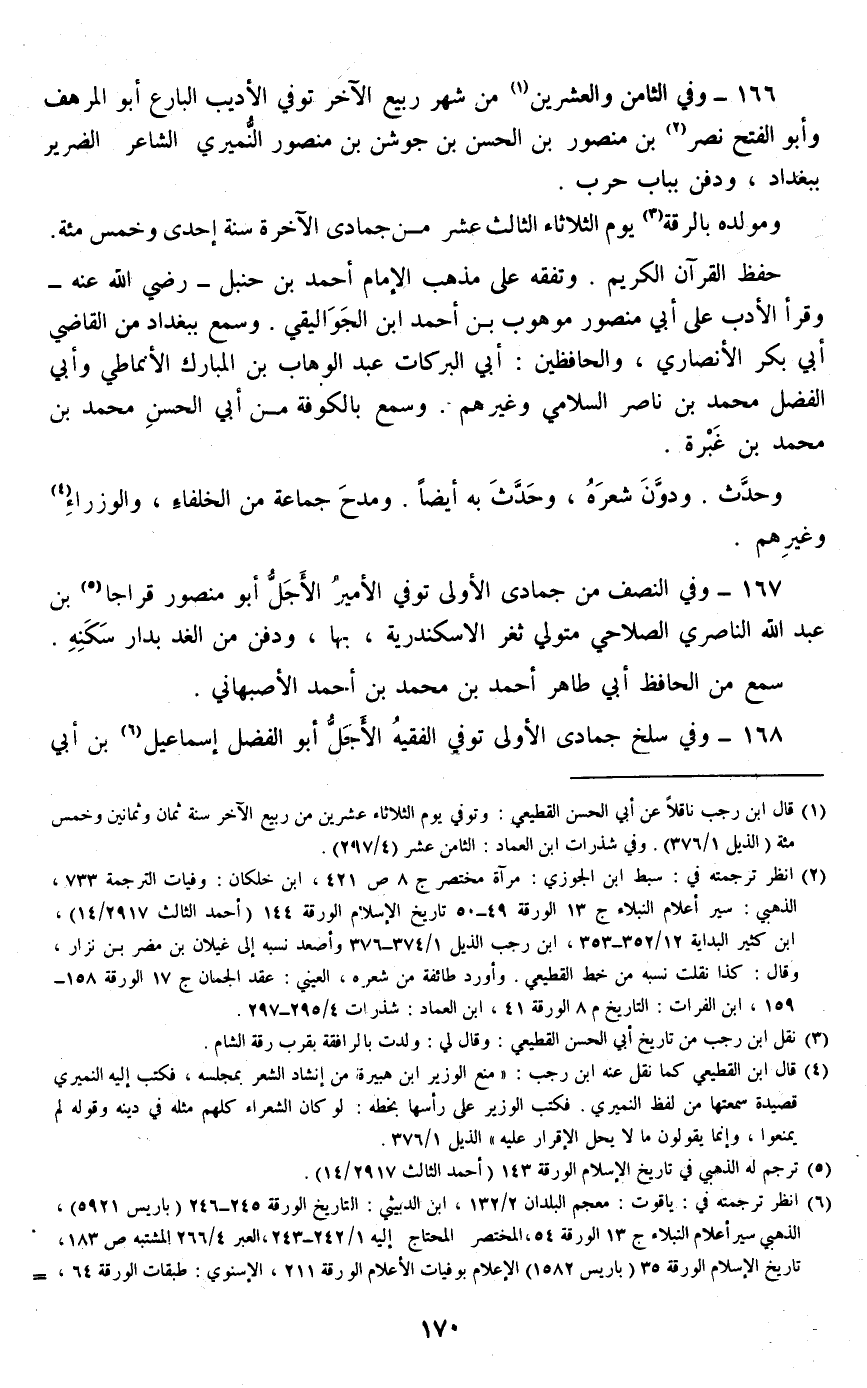 166 - وفي الثامن والعشرين من شهر ربيع الآخر توفي الأديب البارع أبو المرهف وأبو الفتح نصر بن منصور بن الحسن بن جوشن بن منصور النميري الشاعر الضرير ببغداد، ودفن بباب حرب.