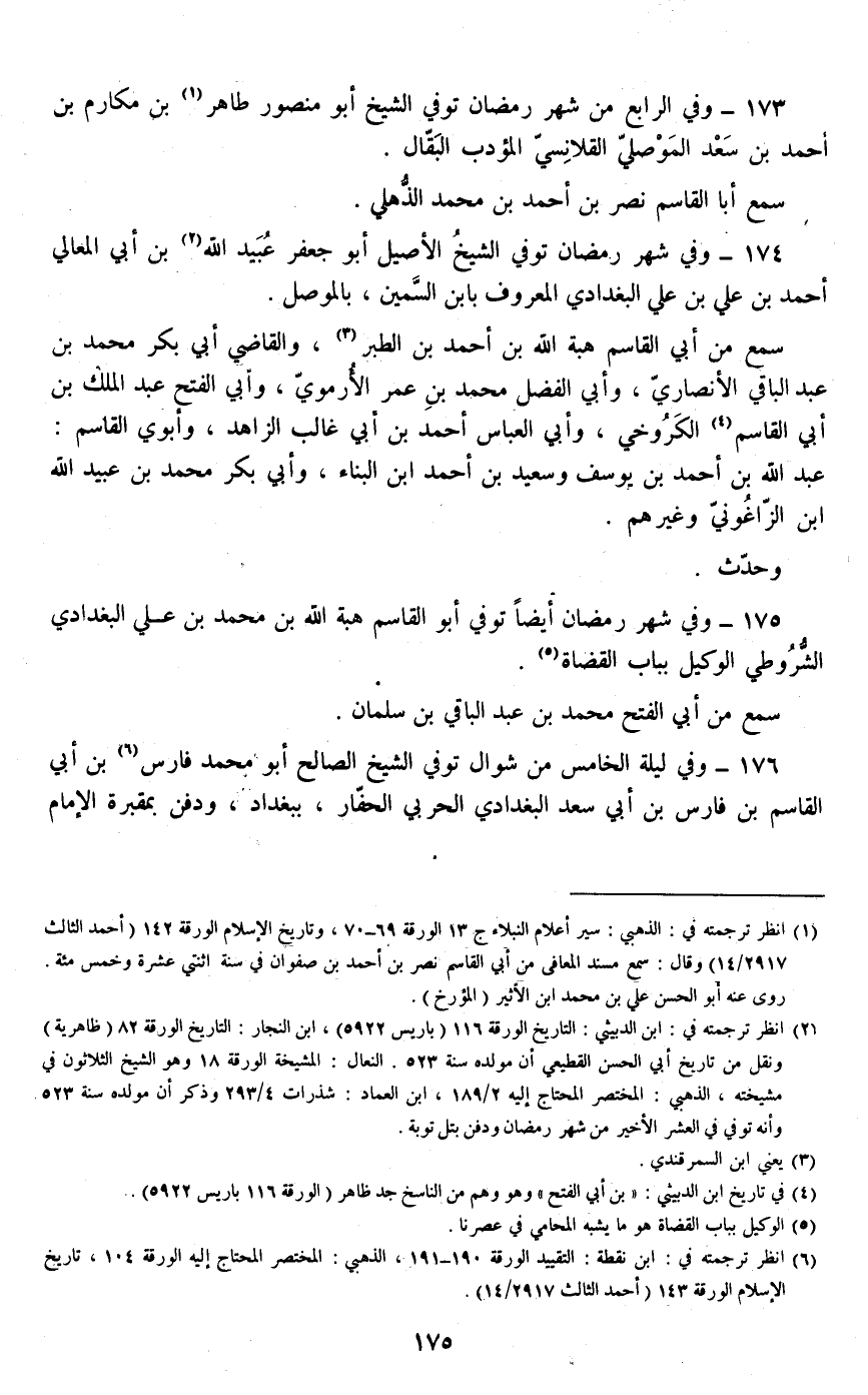 173 - وفي الرابع من شهر رمضان توفي الشيخ أبو منصور طاهر بن مكارم بن أحمد بن سعد الموصلي القلانسي المؤدب البقال