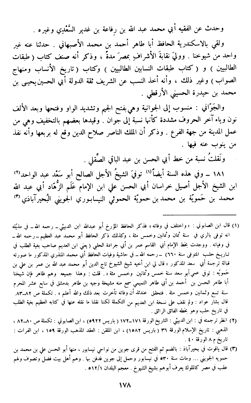 181 - وفي هذه السنة أيضا توفي الشيخ الأجل الصالح أبو سعد عبد الواحد ابن الشيخ الأجل أصيل خراسان أبي الحسن علي ابن الإمام علم الزهاد أبي عبد الله محمد بن حموية بن محمد بن حموية الحموئي النيسابوري الجويني البحير آباذي الشافعي الصوفي، #179# بالري.
