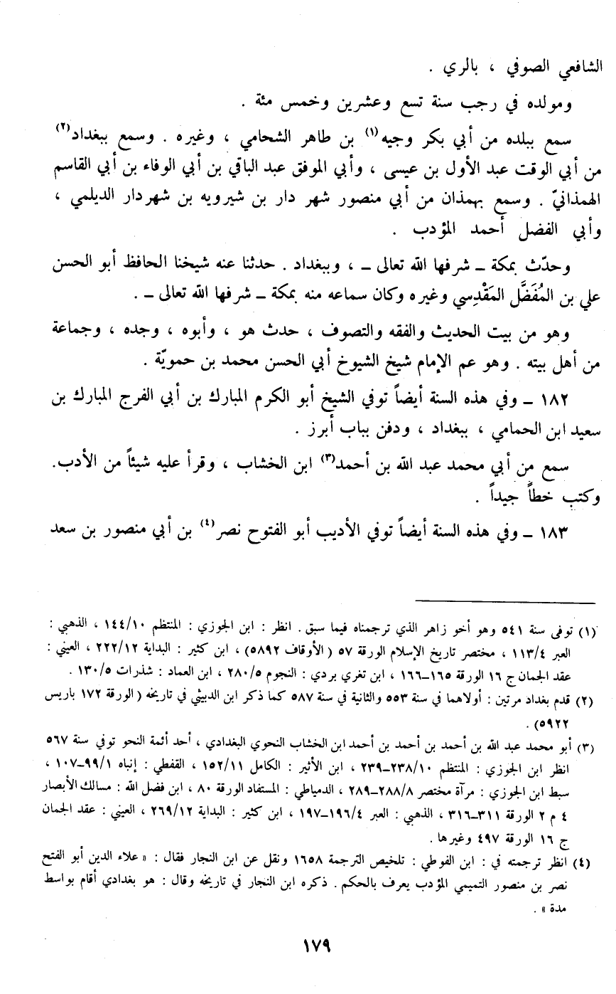 183 - وفي هذه السنة أيضا توفي الأديب أبو الفتوح نصر بن أبي منصور بن سعد بن نصر البغدادي المعروف بابن حمان #180# ببغداد.