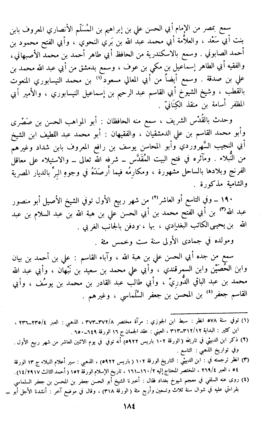 190 - وفي التاسع أو العاشر من شهر ربيع الأول توفي الشيخ الأصيل أبو منصور عبد الله بن أبي الفتح محمد بن أبي الحسن علي بن هبة الله بن عبد السلام بن عبد الله بن يحيى الكاتب البغدادي، بها، ودفن بالجانب الغربي.