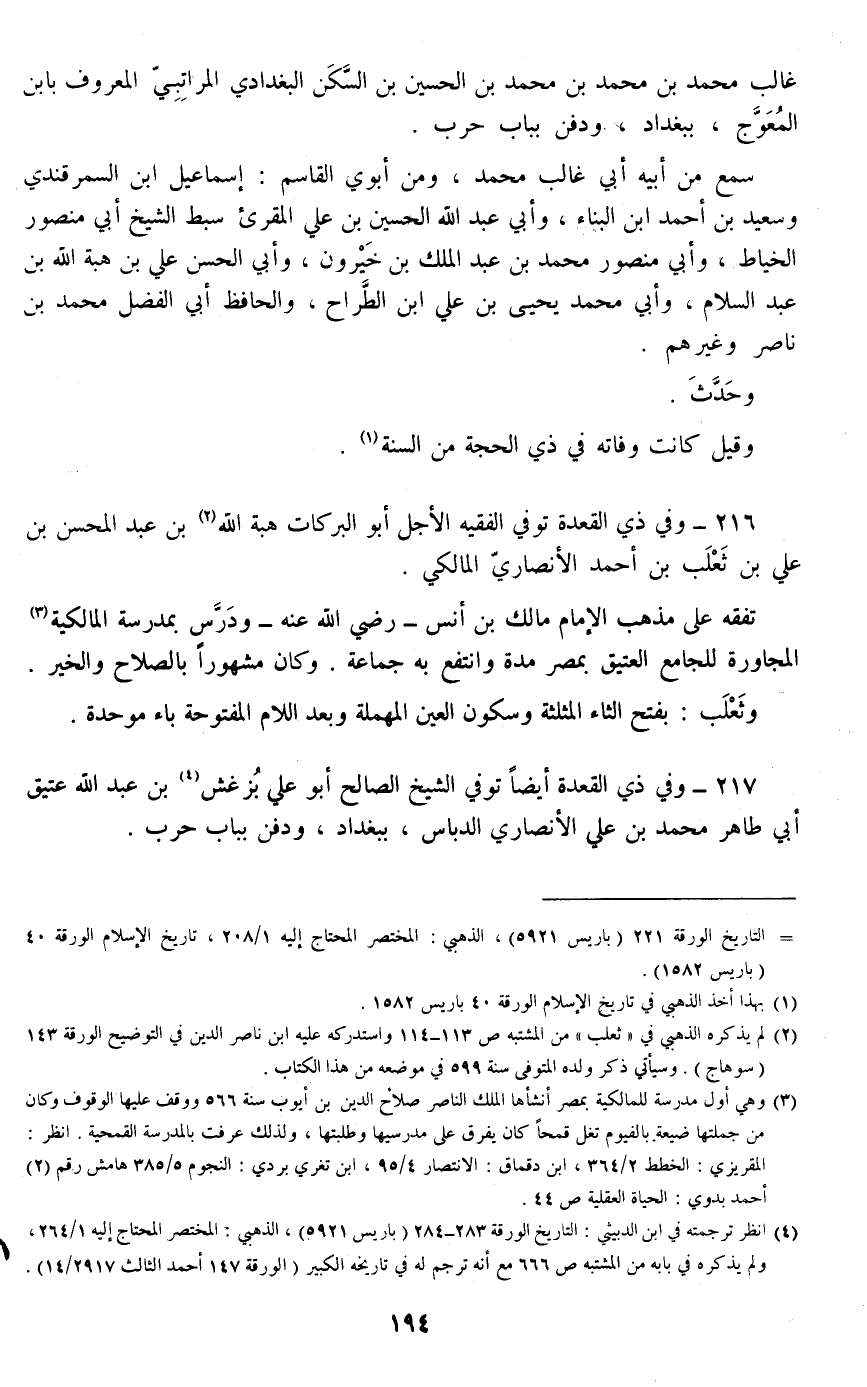216 - وفي ذي القعدة توفي الفقيه الأجل أبو البركات هبة الله بن عبد المحسن بن علي بن ثعلب بن أحمد الأنصاري المالكي