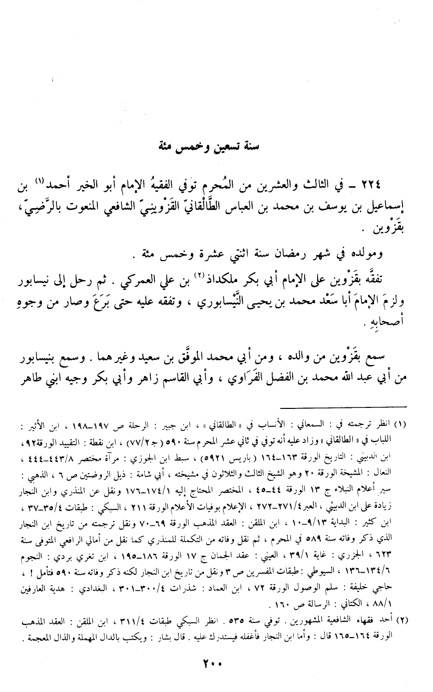 224 - في الثالث والعشرين من المحرم توفي الفقيه الإمام أبو الخير أحمد بن إسماعيل بن يوسف بن محمد بن العباس الطالقاني القزويني الشافعي المنعوت بالرضي، بقزوين.