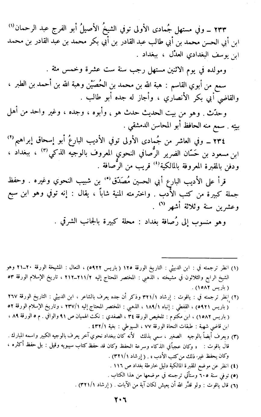 233 - وفي مستهل جمادى الأولى توفي الشيخ الأصيل أبو الفرج عبد الرحمان بن أبي الحسن محمد بن أبي طالب عبد القادر بن أبي بكر محمد بن عبد القادر بن محمد بن يوسف البغدادي العدل، ببغداد.