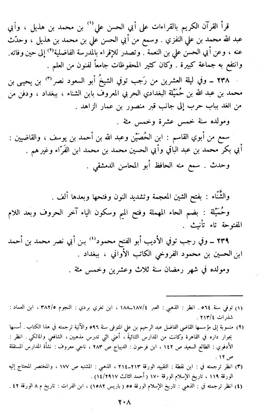 238 - وفي ليلة العشرين من رجب توفي الشيخ أبو السعود نصر بن يحيى بن محمد بن عبد الله بن حميلة البغدادي الحربي المعروف بابن الشناء، ببغداد، ودفن من الغد بباب حرب إلى جانب قبر منصور بن عمار الزاهد.