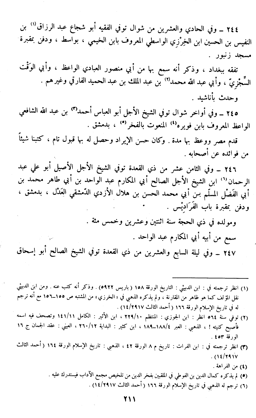 246 - وفي الثامن عشر من ذي القعدة توفي الشيخ الأجل الأصيل أبو علي عبد الرحمان ابن الشيخ الأجل الصالح أبي المكارم عبد الواحد بن أبي طاهر محمد بن أبي الفضل المسلم بن أبي محمد الحسن بن هلال الأزدي الدمشقي العدل، بدمشق، ودفن بمقبرة باب الفراديس.