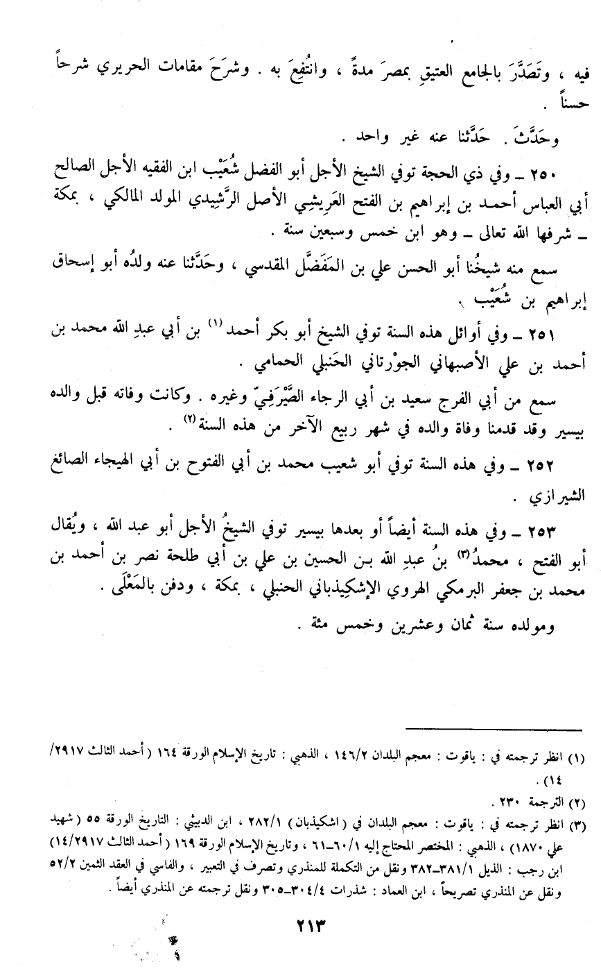 253 - وفي هذه السنة أيضا أو بعدها بيسير توفي الشيخ الأجل أبو عبد الله، ويقال أبو الفتح، محمد بن عبد الله بن الحسين بن علي بن أبي طلحة نصر بن أحمد بن محمد بن جعفر البرمكي الهروي الإشكيذباني الحنبلي، بمكة، ودفن بالمعلى.