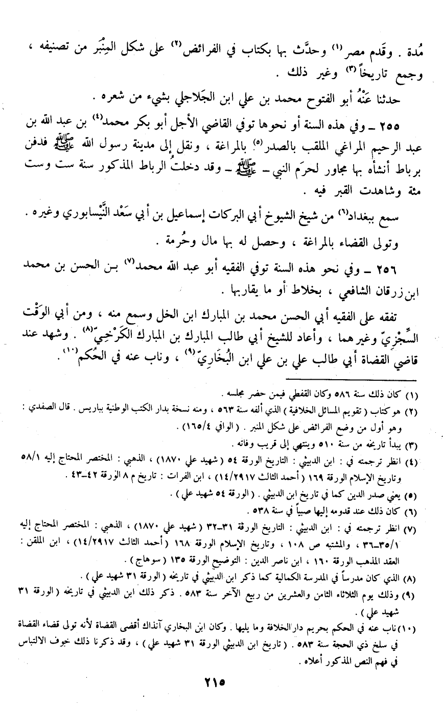 255 - وفي هذه السنة أو نحوها توفي القاضي الأجل أبو بكر محمد بن عبد الله بن عبد الرحيم المراغي الملقب بالصدر، بالمراغة، ونقل إلى مدينة رسول الله صلى الله عليه وسلم فدفن برباط أنشأه بها مجاور لحرم النبي –صلى الله عليه وسلم- وقد دخلت الرباط المذكور سنة ست وست مئة وشاهدت القبر فيه.
